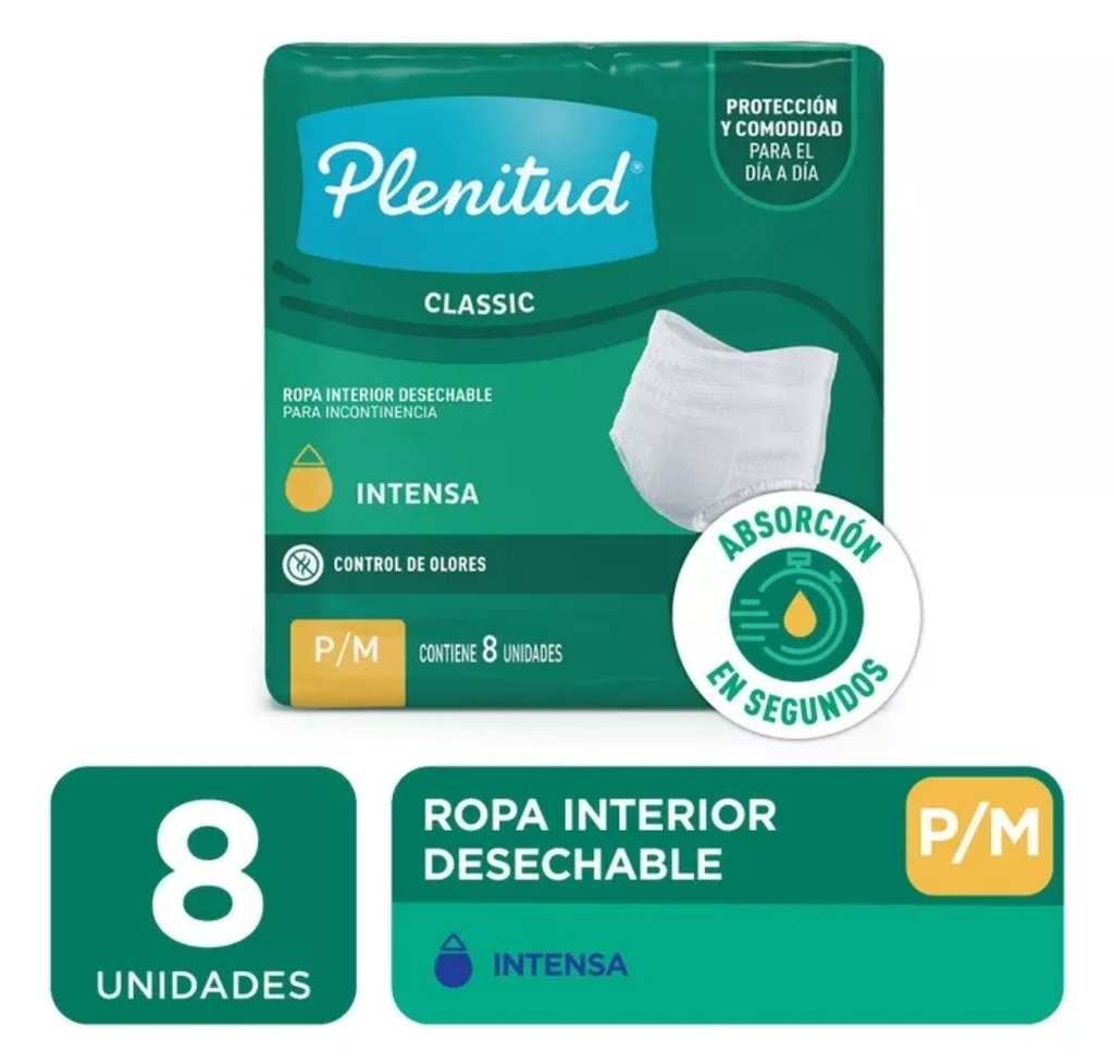 La ropa interior desechable brinda comodidad y protección a los adultos con incontinencia. Contiene 8 unidades en cada paquete y ofrece la misma absorción que el pañal classic pero con más confort y discreción, Fácil de poner y quitar.