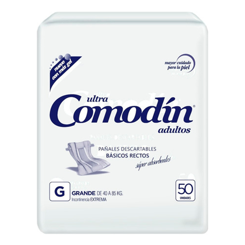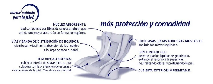 Línea Básica de pañales rectos para adultos. Con gel súper absorbente. Con cintas adhesivas ajustables. Brinda comodidad y protección por sus vías anti-desbordes. Con cubierta interior de tela hipoalergénica con aloe vera de suave textura que colabora en la prevención de escaras.