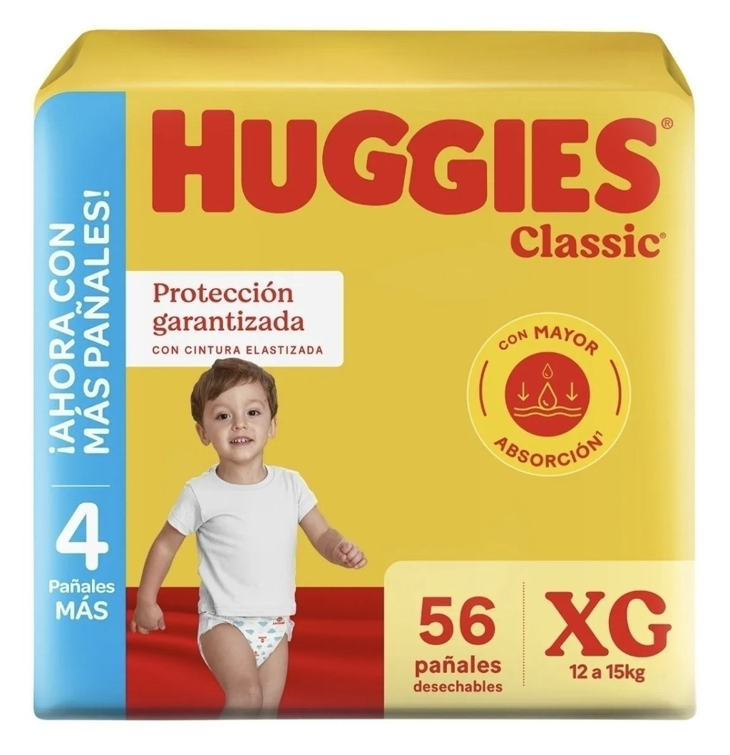 Los Pañales Huggies Classic Talle XG, en su paquete de 56 unidades, ofrecen una solución ideal para mantener a tu bebé seco y cómodo.