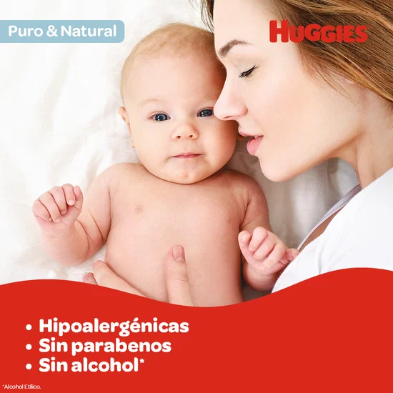 Las Toallitas Húmedas Huggies Puro y Natural fueron especialmente pensadas para recién nacidos son 0% alcohol y no contienen fragancia.