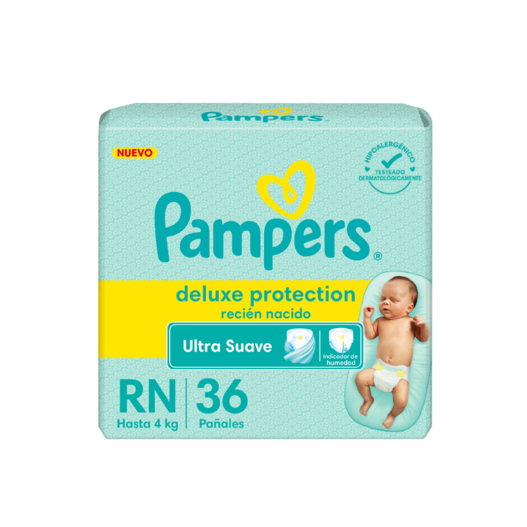 Pampers Deluxe Protection Recién Nacido cuenta con la máxima absorción y suavidad de Pampers para proteger delicadamente la piel de tu bebé desde el primer día.